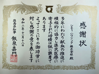 11月18日、献血活動への多年にわたる功労に対し、徳島県知事から感謝状を授与いただきました。